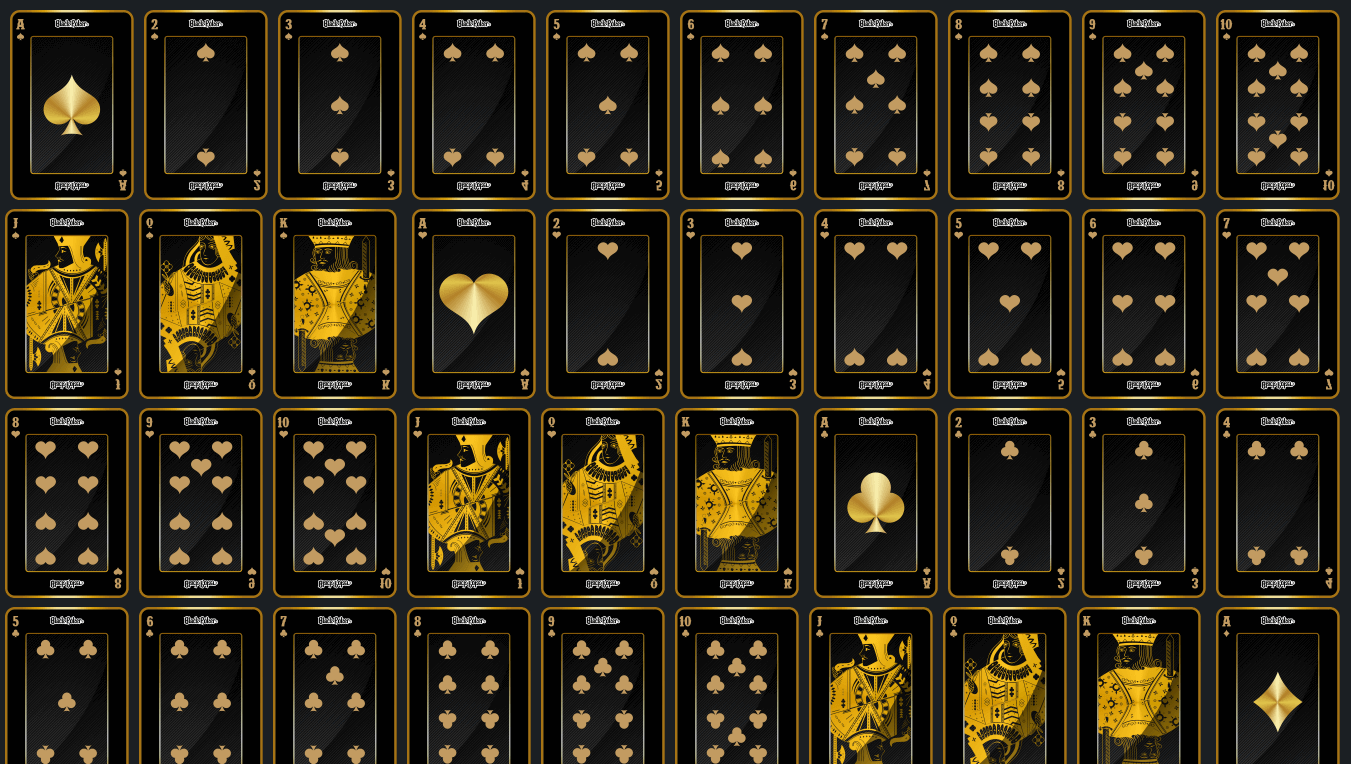 Enter a world of opulence and luxury with this custom black and gold deck that conveys richness and elegance through its texture, color and shine. Each card features intricate details, beautifully embossed with gold foil that catches the light, creating a dazzling spectacle. Luxurious black card stock adds a depth of richness to the deck, making it look like a true masterpiece. Whether you're playing a game of poker or displaying the deck like a work of art, it's sure to impress with its stunning design and unparalleled beauty. Enjoy the extravagance of this deck and elevate your gaming experience to new heights.
