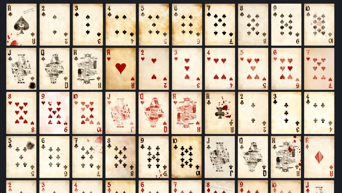 This deck of cards is steeped in Old West legends. Its unique customization on aged paper brings to mind the dusty halls of the time. But what makes it special are the bloodstains and gunshot marks that adorn many of the cards. It was discovered in the pocket of a notorious bandit known as "The Black Ace". Legend has it that this deck was present in many of his infamous robberies and shootouts, becoming a symbol of his skill and daring. When holding this deck in your hands, you can't help but feel the thrill of the Wild West, imagining the stories it could tell of lawlessness, danger, and adventure.